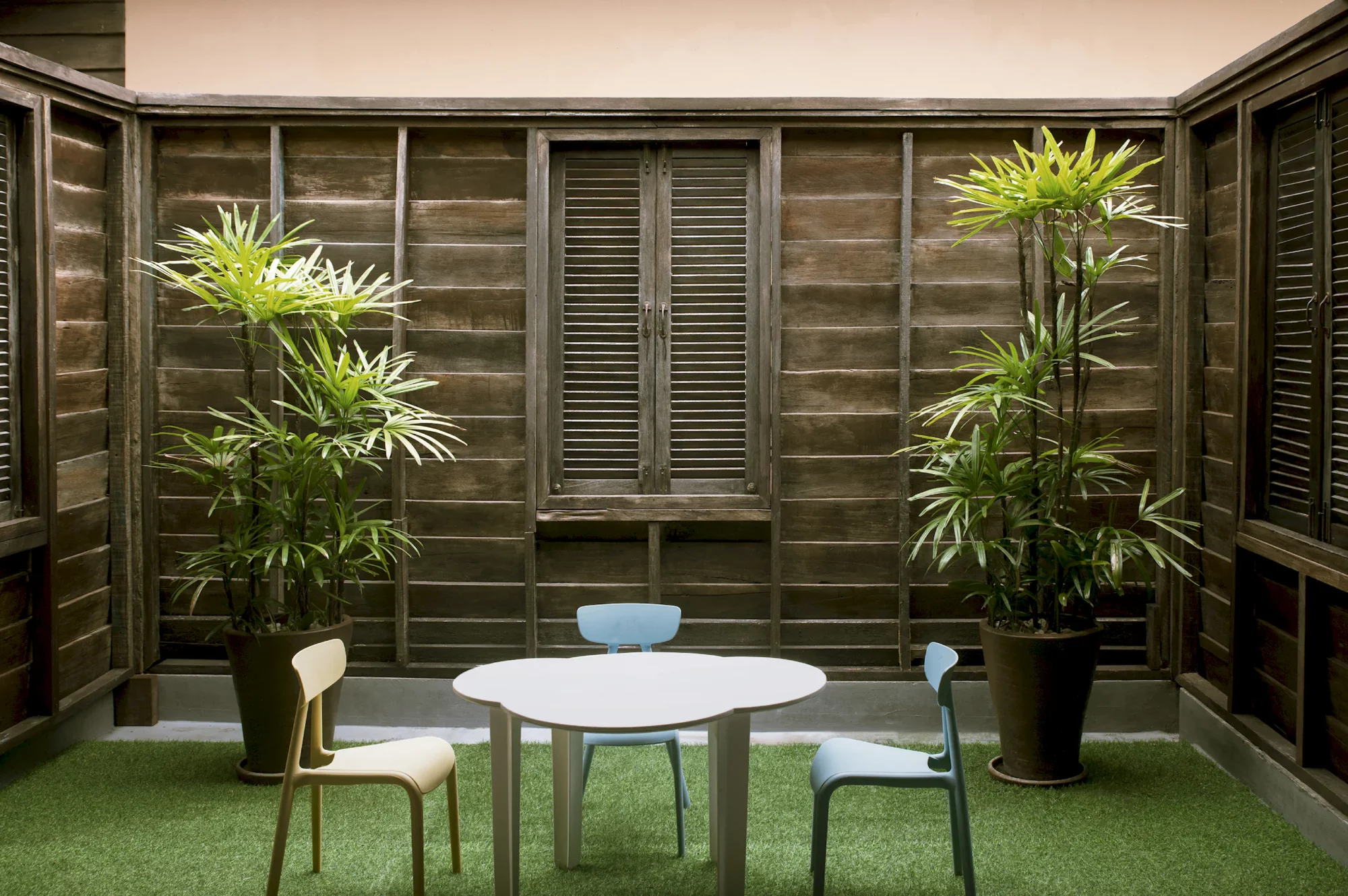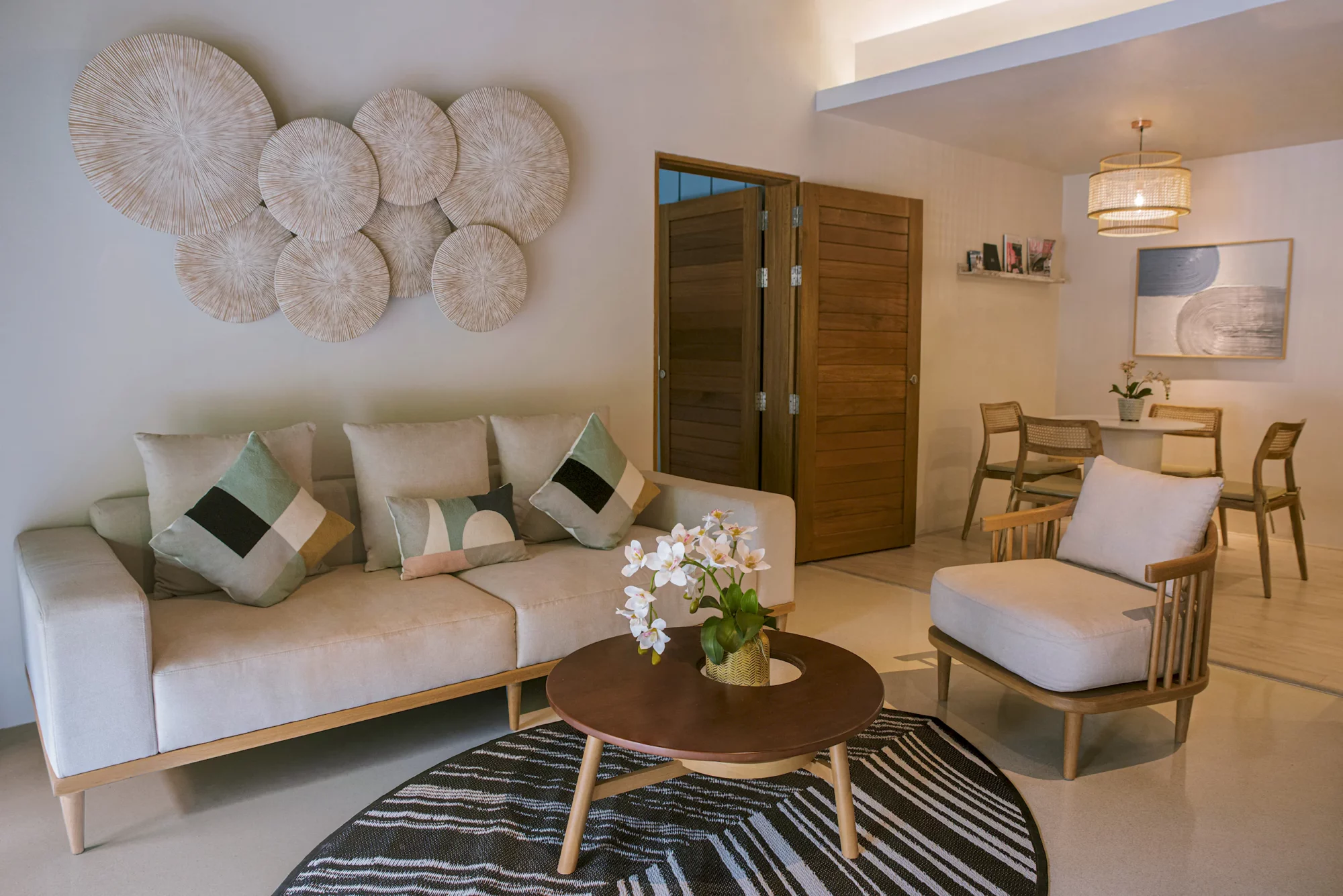 A 105 sq.m sanctuary with a private staircase, featuring a master bedroom (king-size bed), a twin-bedroom, a central living room, dining area, and pantry with Nespresso machine. Enjoy two balconies—one enclosed for safety, one overlooking the village square.